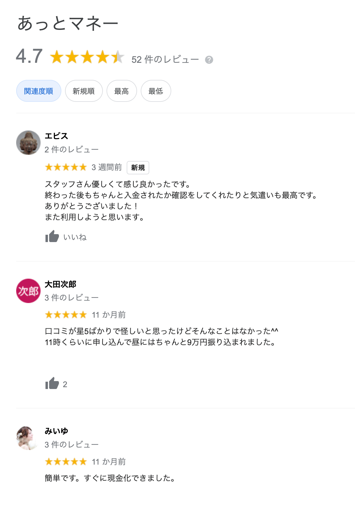 お店に行く必要もないし、10分くらいで終わって入金も早かったです。